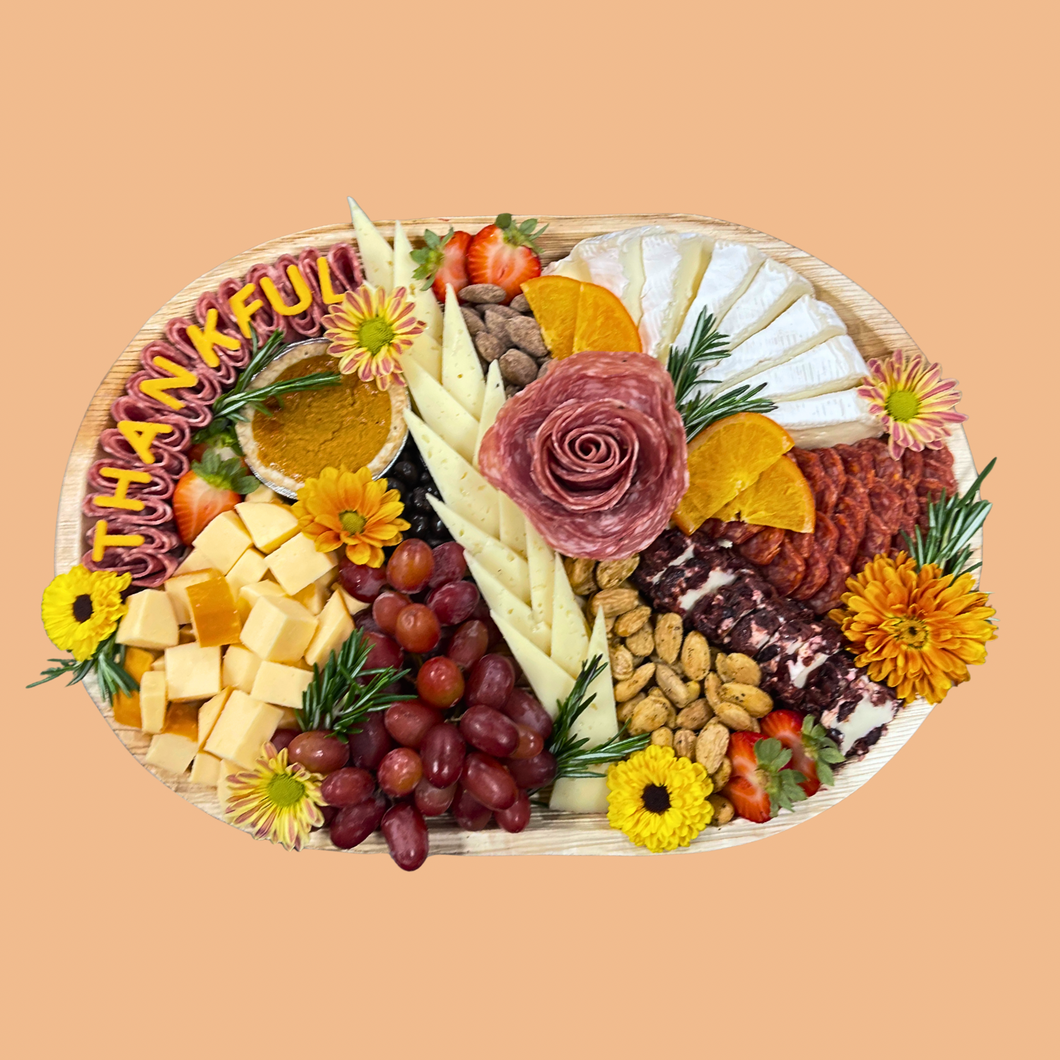 The Thankful Board is returning in three sizes (medium, large, XL) making it the perfect option for your next gathering. This Thanksgiving themed board features artisanal cheeses, freshly sliced meats, seasonal fruit, and autumn inspired accompaniments.
